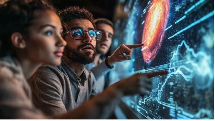 Glancing quickly at the LCD wall – changing it to a blank canvass, you begin sketching out a diagram. The Sun and planets – Earth – Mars – Jupiter. Inscribing their orbits. Just like her – enthusiastic and equally passionate.