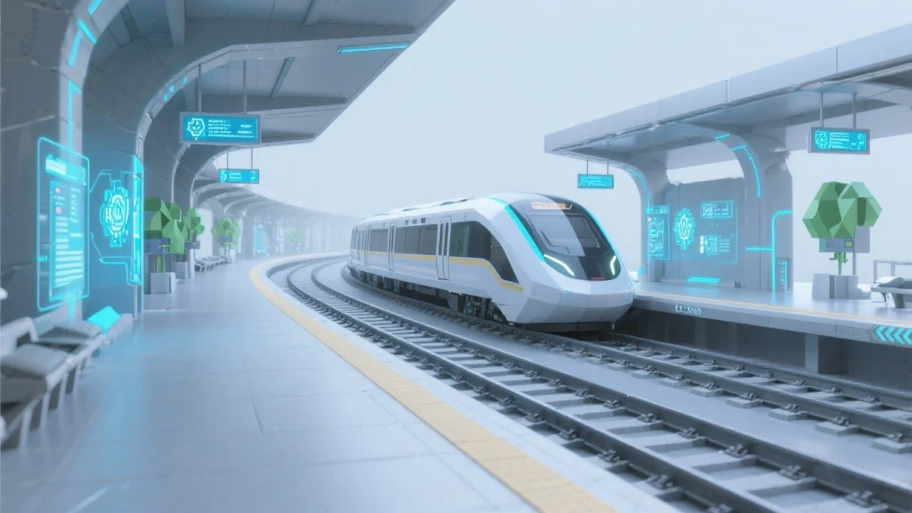 It’s not just the street. The platform is a menagerie of virtual screens, more automation than seems reasonable, [no employees] and holographic surveillance cameras. And the wedge-shaped Maglev from some visionary designer’s dream is startling. It’s like a future reality that was only concept drawings yesterday here today.