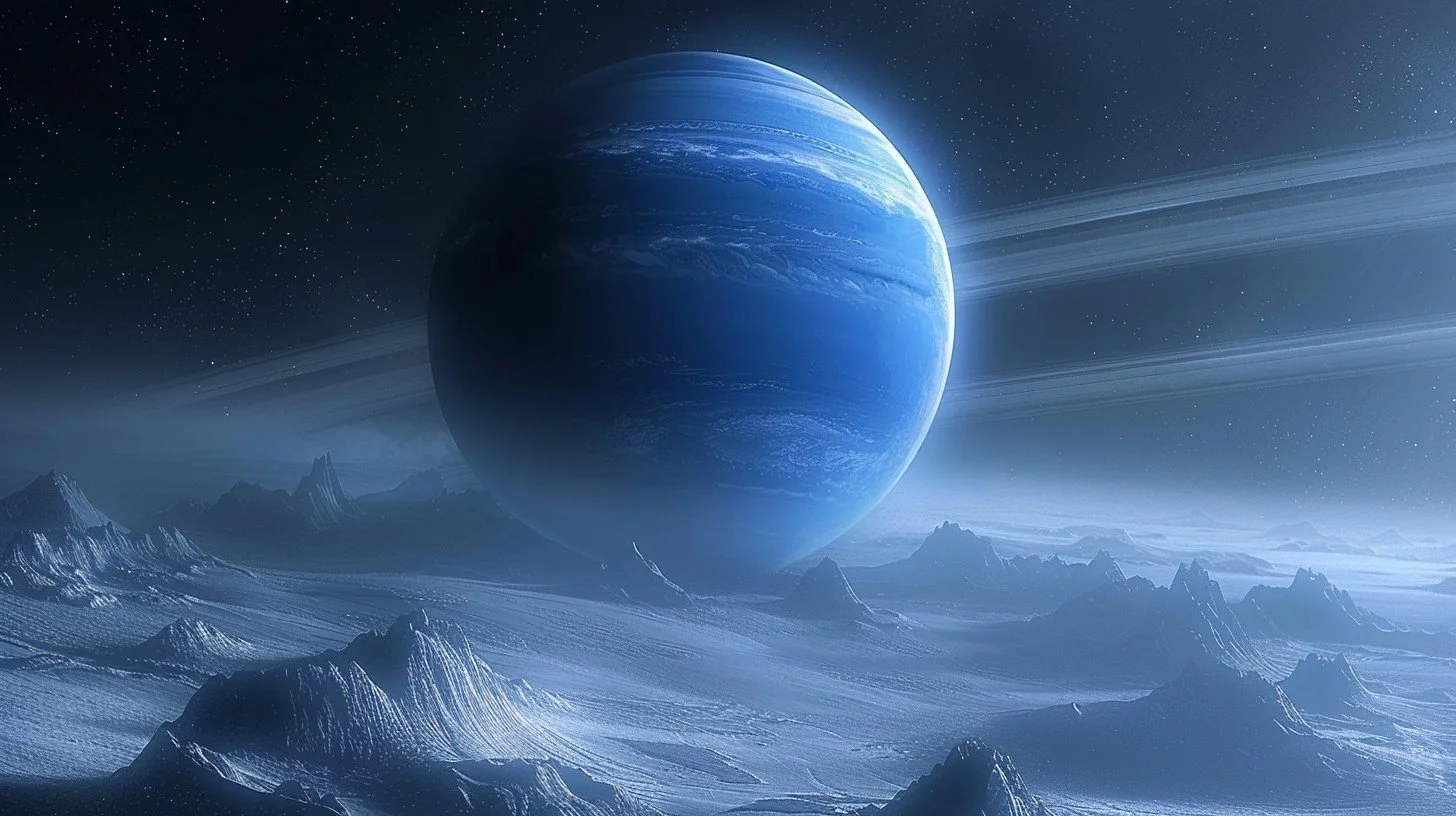 Now from orbit above a lifeless planet with a cool blue star, you descend as if on a platform of air to the base of a crater.
