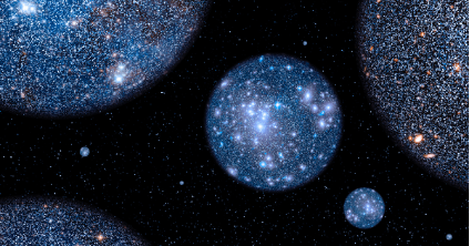 Outside are other, parallel universes we can’t see – copies of ours but many if not most with different laws of physics. Imagine a balloon 93 billion light years across in infinite space scrunched like you were in the crowded lift on your way up to your apartment between infinite other balloon-shaped universes.